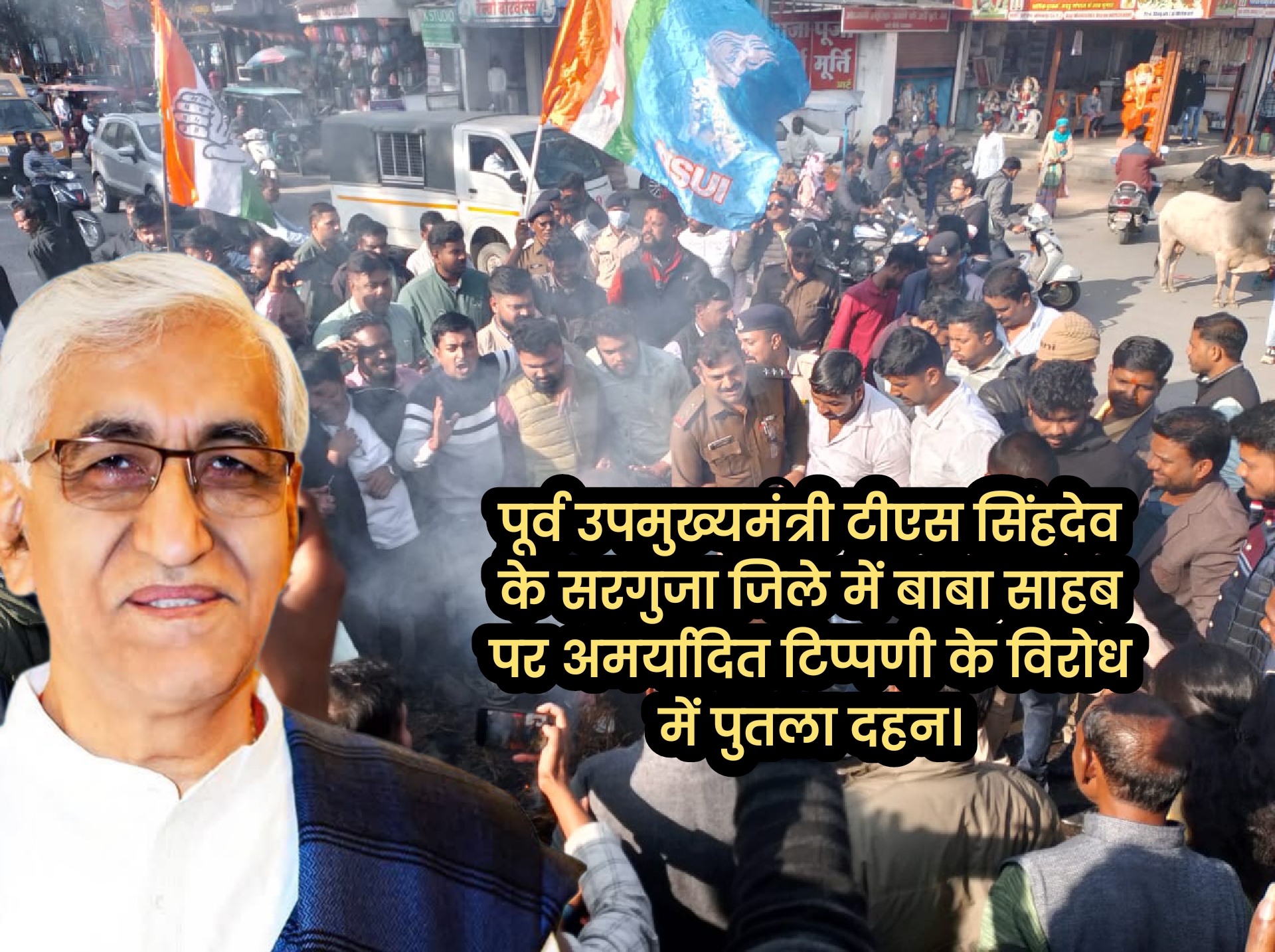 पूर्व उपमुख्यमंत्री टीएस सिंहदेव के सरगुजा जिले में बाबा साहब पर अमर्यादित टिप्पणी के विरोध में पुतला दहन।