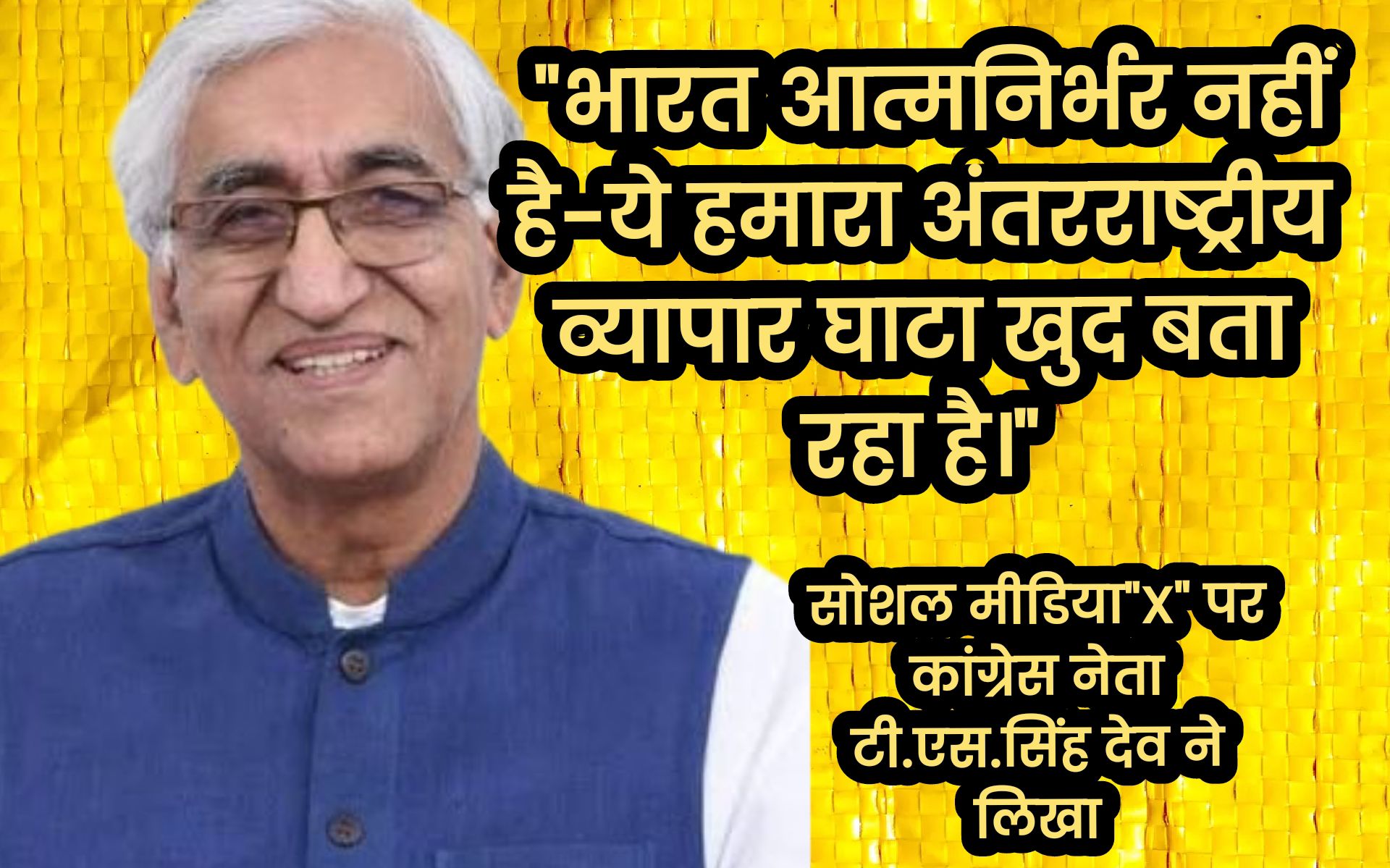 सोशल मीडिया”X” पर कांग्रेस नेता टी.एस.सिंह देव ने लिखा “भारत आत्मनिर्भर नहीं है-ये हमारा अंतरराष्ट्रीय व्यापार घाटा खुद बता रहा…