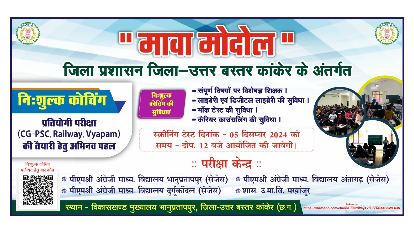 नि शुल्क कोचिंग हेतु पंजीयन 04 दिसम्बर तक स्क्रीनिंग टेस्ट 05 दिसम्बर को उत्तर बस्तर कांकेर/कलेक्टर निलेश कुमार महादेव क्षीरसागर…