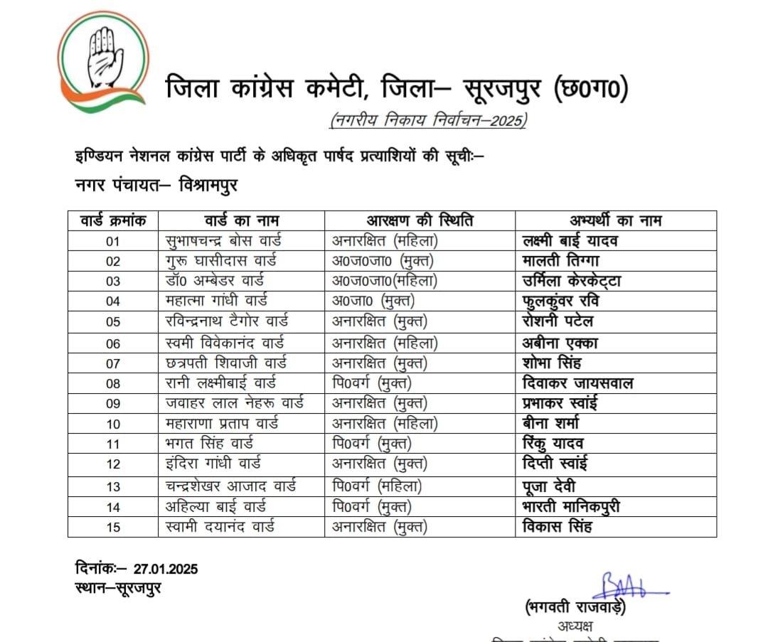 नगरीय निकाय चुनाव 2025 : काग्रेस ने अम्बिकापुर नगर निगम के पार्षद पद के प्रत्याशियों की सूची जारी किया !