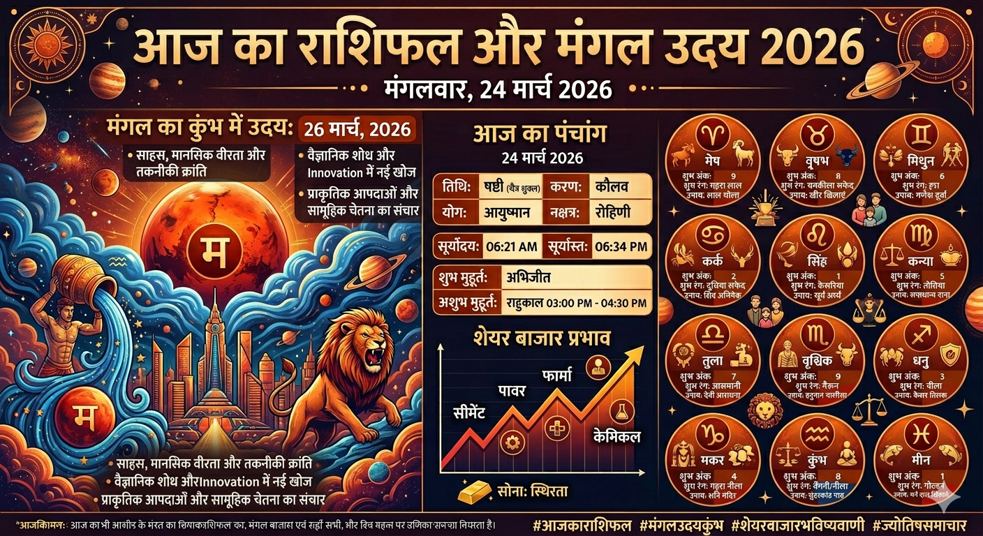 आज का पंचांग और राशिफल 24 मार्च 2026: मंगल का कुंभ में उदय और विशेष ज्योतिषीय गणना दैनिक महा-राशिफल एवं…