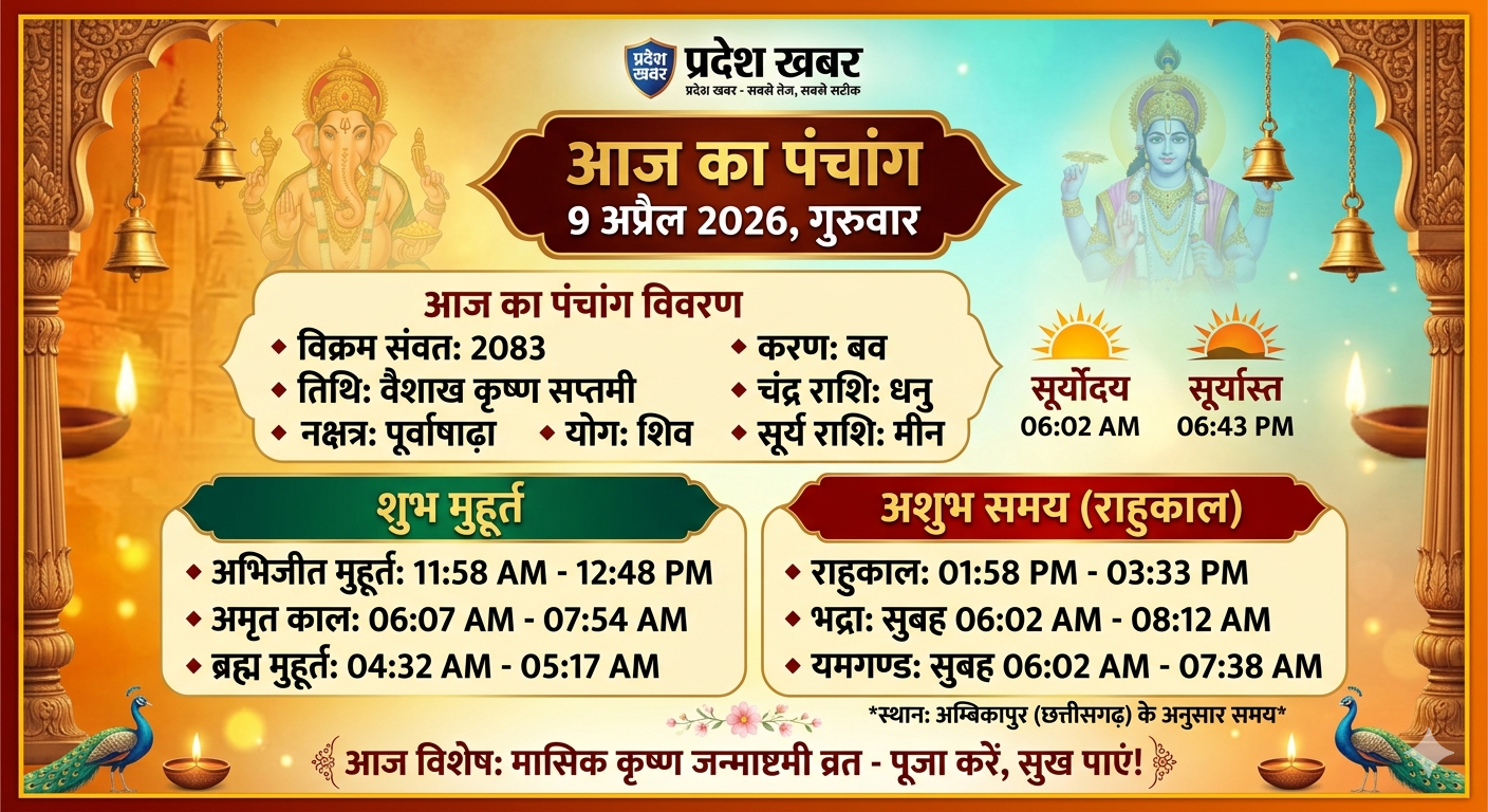 आज का पंचांग 9 अप्रैल 2026: वैशाख कृष्ण सप्तमी, जानें शुभ मुहूर्त, राहुकाल और आज का राशिफल।