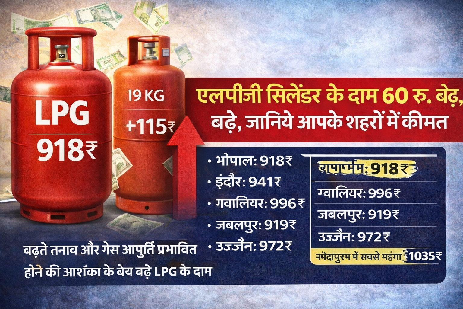रसोई गैस सिलेंडर 60 रुपए महंगा, आज से नई कीमतें लागू भोपाल। केंद्र सरकार ने घरेलू एलपीजी गैस सिलेंडर के…