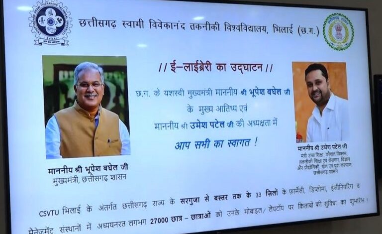 रायपुर। मुख्यमंत्री भूपेश बघेल ने आज यहां अपने निवास कार्यालय में आयोजित वर्चुअल कार्यक्रम में छत्तीसगढ़ स्वामी विवेकानंद तकनीकी विश्वविद्यालय भिलाई की ई-लाईब्रेरी का उद्घाटन किया। ई-लाईब्रेरी के माध्यम से सरगुजा से बस्तर तक 33 ज़िलों के फ़ार्मेसी, डिप्लोमा, इंजीनियरिंग व मैनेजमेंट संस्थानों में अध्ययनरत 27,000 छात्र-छात्राओं को उनके मोबाइल और लैपटॉप पर ऑनलाईन किताबों कि सुविधा उपलब्ध हो सकेगी।