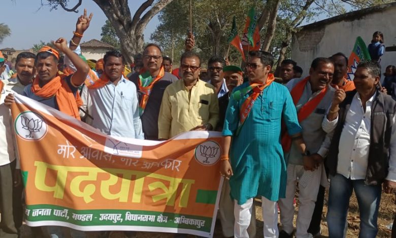 पी0एस0यादव/ब्यूरो चीफ/सरगुजा// भाजपा के “मोर आवास मोर अधिकार” अभियान अंतर्गत भाजपा जिला महामंत्री एवं मंडल प्रभारी अभिमन्यु गुप्ता तथा जिला सह संवाद प्रमुख एवं मंडल सह प्रभारी रूपेश दुबे के मुख्य आतिथ्य तथा मंडल अध्यक्ष अनिल प्रताप सिंह के नेतृत्व में उदयपुर भाजपा मंडल के ग्राम नुनेरा से रिखी होते हुए सलका तक पदयात्रा निकाली गई।