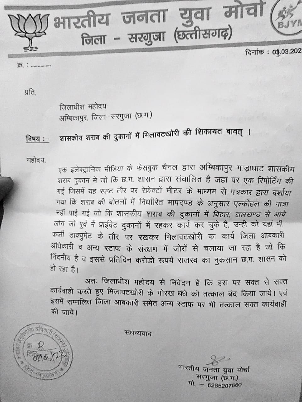 अम्बिकापुर/भारतीय जनता युवा मोर्चा सरगुजा के द्वारा जिले के शासकीय शराब की दुकानों में मिलावटखोरी की शिकायत के संबंध में कलेक्टर के नाम एस.डी.एम. को ज्ञापन सौपा जैसा कि प्राप्त जानकारी के अनुसार एक इलेक्ट्रानिक मीडिया के फेसबुक चैनल द्वारा अम्बिकापुर गाड़ाघाट शासकीय शराब दुकान में जो कि छ.ग. शासन द्वारा संचालित है जहां पर एक रिपोर्टिंग की गई जिसमें यह स्पष्ट तौर पर रेफ्रेक्टों मीटर के माध्यम से पत्रकार द्वारा दर्षाया गया कि शराब की बोतलों में निर्धारित मापदण्ड के अनुसार एल्कोहल की मात्रा नहीं पाई गई जो कि शासकीय शराब की दुकानों में बिहार, झारखण्ड से आये लोग जो पूर्व में प्राईवेट दुकानों में रहकर कार्य कर चुके है, उन्ही को यहां भी फर्जी डाक्युमेट के तौर पर रखकर मिलावटखोरी का कार्य जिला आबकारी अधिकारी व अन्य स्टाफ के संरक्षण में जोरों से चलाया जा रहा है जो कि निंदनीय है व इससे प्रतिदिन करोडों रूपये राजस्व का नुकसान छ.ग. शासन को हो रहा है। ज्ञापन सौपते वक्त भाजयुमो प्रदेष महामंत्री अंकित जायसवाल, जिला महामंत्री संजीव वर्मा, प्रदेष प्रषिक्षण प्रमुख अभिषेक प्रताप सिंह, जिला उपाध्यक्ष रोचक गुप्ता, शानु कष्यप, सिकन्दर जायसवाल, जिला मंत्री विकास शुक्ला (चंदन), अमित दुबे, मण्डल अध्यक्ष निषान्त सिंह शोलू, रवि सोनी, मार्कण्डेय तिवारी, वेदान्त तिवारी, सौरव सिंह, भोलू सिंह, प्रिन्स तिवारी आदि उपस्थित रहे।