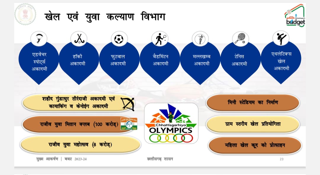 इस बजट में राज्य में खेलों को बढ़ावा देने के लिए विभिन्न राष्ट्रीय व अंतर्राष्ट्रीय खेल यथा एडवेंचर स्पोर्ट्स, हॉकी, फुटबॉल, बैडमिंटन, टेनिस, एथलेटिक्स जैसे खेल अकादमी की स्थापना का प्रावधान किया गया है। इसी तरह शहीद गुंडाधुर तीरंदाजी एवं कायाकिंग व केनोइंग खेल अकादमी की भी स्थापना की जाएगी।