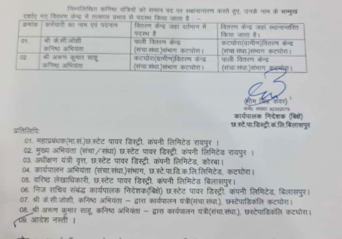 कोरबा/पाली:- मनमाने एवं अड़ियल कार्य रवैये के लिए चर्चित पाली विद्युत विभाग में पदस्थ जेई के.सी. जोशी को अपने कार्य करने के तौर- तरीका व स्थानीय जनप्रतिनिधियों की उपेक्षा भारी पड़ गई जिसके कारण उन्हें पाली से हटा दिया गया है तथा उनके स्थान पर अरुण कुमार को पाली की जवाबदारी सौंपी गई है।छत्तीसगढ़ स्टेट पॉवर डिस्ट्रीब्यूशन कंपनी लिमिटेड के कार्यपालक निदेशक (बिक्षे) भीम सिंह कंवर द्वारा आदेश क्रमांक- 1739, दिनाँक 25 फरवरी 2021 को जारी आदेश के तहत जेई श्री जोशी को पाली से हटाकर विद्युत विभाग कटघोरा भेज दिया गया है तथा कटघोरा विद्युत विभाग (ग्रामीण) की जिम्मेदारी सम्हाल रहे अरुण कुमार साहू को पाली की जवाबदारी सौंपी गई है एवं इन्हें सात दिवस के अंदर कार्यमुक्त कर स्थानांतरित स्थल पर कार्यभार ग्रहण की सूचना अधीक्षण यंत्री कोरबा एवं कार्यपालक अभियंता कटघोरा द्वारा आवश्यक रूप से प्रेषित करने आदेशित किया गया है।उल्लेखनीय है कि विद्युत विभाग पाली में विगत लगभग 2- 3 वर्षों से पदस्थ जेई श्री जोशी के कार्य करने का तरीका प्रारंभ से ही मनमाना और अड़ियल भरा रहा है जिसके कारण विद्युत उपभोक्ता काफी परेशान रहे है।इसके अलावा विद्युत समस्या के सुधार की दिशा में स्थानीय जनप्रतिनिधियों की बातों को अनसुना कर लगातार घोर उपेक्षा किये जाने को लेकर भी उन्हें पाली से हटाए जाने को एक कारण माना जा रहा है।