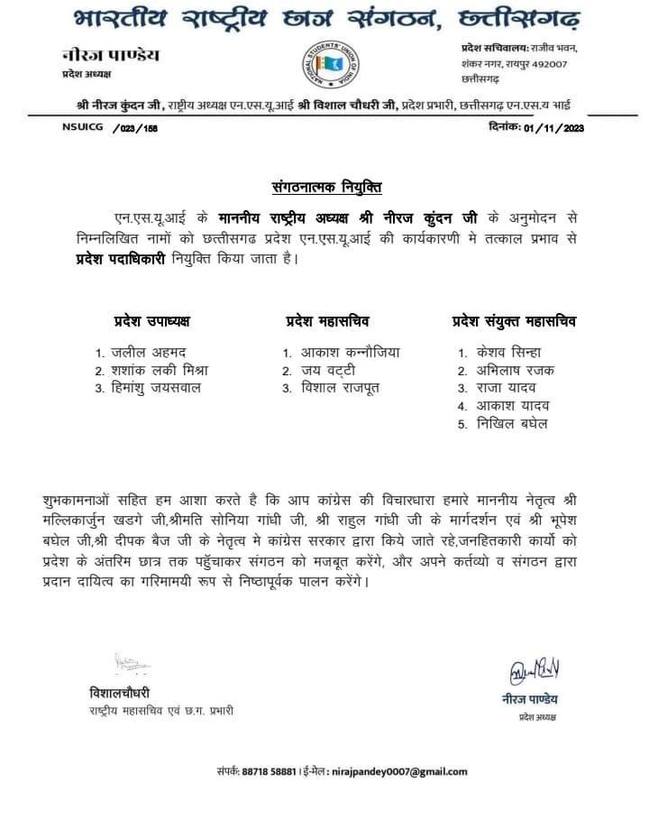एनएसयूआई के प्रदेश अध्यक्ष नीरज पांडेय ने सभी को शुभकामनाएं देते हुए कहा कि हम आशा करते है- की आप कांग्रेस की विचारधारा हमारे माननीय नेतृत्व मल्लिकार्जुन खड़गे,सोनिया गांधी, राहुल गांधी जी के मार्गदर्शन एवं भूपेश बघेल, दीपक बैज जी के नेतृत्व में कांग्रेस सरकार द्वारा किये जाते रहे, जनहितकारी कार्यों को प्रदेश के अंतरिम छात्र तक पहुंचाकर संगठन को मजबूत करेंगे और अपने कर्तव्यों व संगठन द्वारा प्रदान दायित्व का गरिमामयी रूप से निष्ठापूर्वक पालन करेंगे।