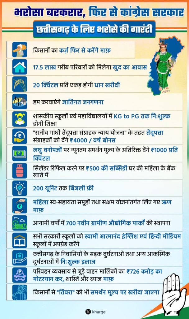 रायपुर। छत्तीसगढ़ विधानसभा चुनाव 2023 को लेकर प्रदेश में राजनीतिक पार्टियां जनता को लुभाने में लगी हुई है. वहीं भाजपा ने शुक्रवार को अपना घोषणा पत्र जारी कर दिया है. जिसमें 20 से अधिक वादे शामिल है. वहीं कांग्रेस ने अब तक अपना घोषणा पत्र नहीं जारी किया है. इसको लेकर बड़ी अपडेट आई है कि कांग्रेस रविवार यानी कल घोषणा पत्र जारी करेगी.