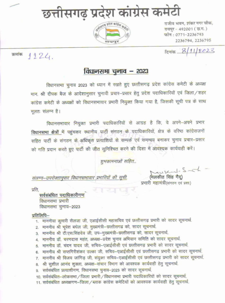 Cg Election 2023 : चुनाव में प्रचार-प्रसार के लिए कांग्रेस ने की विधानसभावार प्रभारियों की नियुक्ति, देखिए सूची
