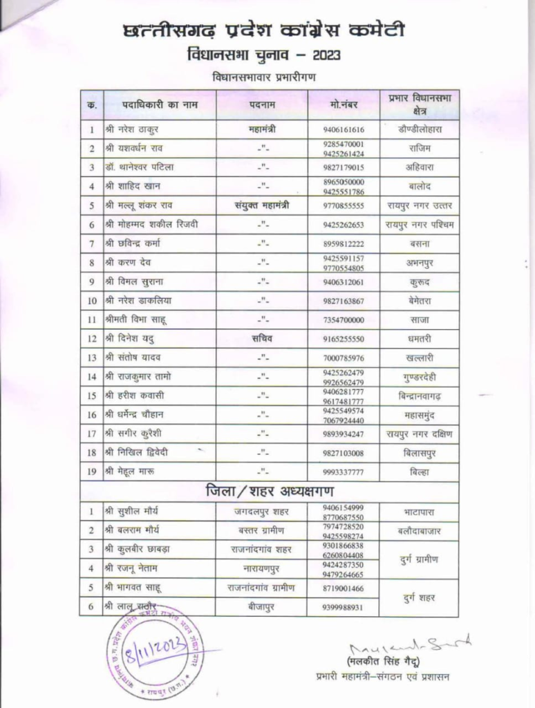 रायपुर। छत्तीसगढ़ कांग्रेस कमेटी ने चुनाव प्रचार-प्रसार के लिए प्रदेश पदाधिकारियों, जिला और शहर कांग्रेस कमेटी के अध्यक्षों को विधानसभावार प्रभारी नियुक्त किया है.