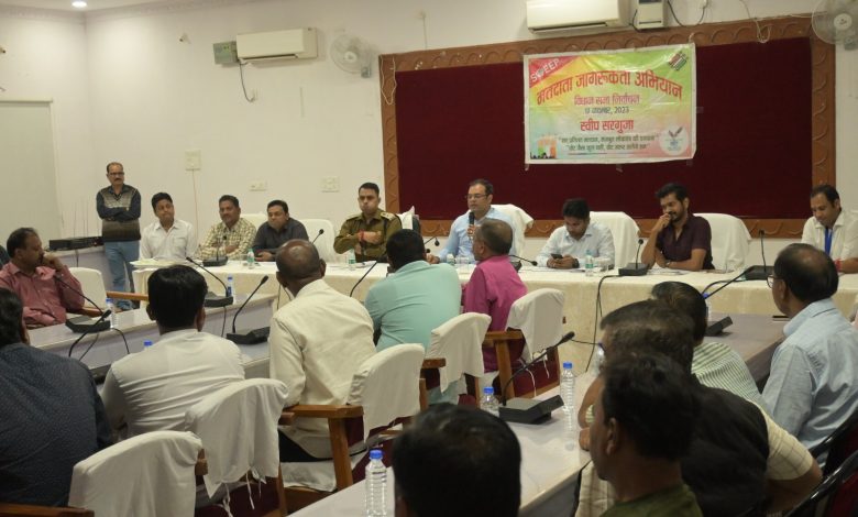 पी0एस0यादव/ब्यूरो चीफ/सरगुजा// जिले में प्रथम बार ऐसा हुआ जब मतदान से पूर्व जिले के समस्त संघों, संगठनों एवं विभिन्न संस्थानों के प्रतिनिधि तथा सदस्य एक साथ इकट्ठे हुए। कलेक्टर एवं जिला निर्वाचन अधिकारी कुंदन कुमार तथा पुलिस अधीक्षक सुनील शर्मा के आह्वान पर जिला पंचायत के सभाकक्ष में सभी की बैठक आहूत की गई। बैठक में जिला पंचायत के मुख्य कार्यपालन अधिकारी एवं स्वीप के नोडल अधिकारी नूतन कुमार कंवर ने जिले में मतदाताओं की संख्या, मतदान केन्द्रों में प्रमुख व्यवस्था, शहरी क्षेत्रों में मतदान प्रतिशत कम होने के प्रमुख कारण, मतदाताओं हेतु केंद्रों में व्यवस्था सहित अन्य महत्वपूर्ण बिंदुओं से सभी को अवगत कराया।