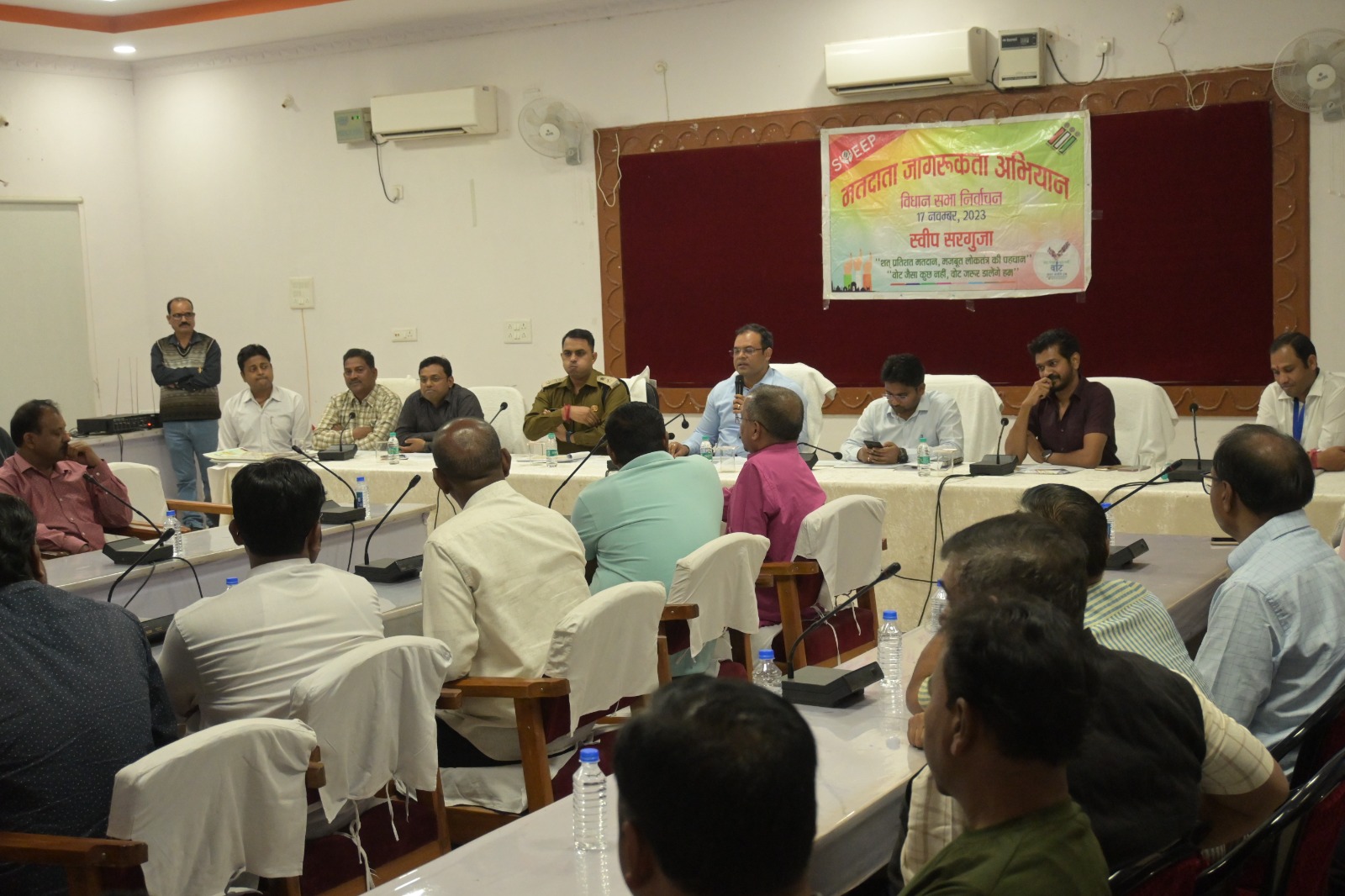 पी0एस0यादव/ब्यूरो चीफ/सरगुजा// जिले में प्रथम बार ऐसा हुआ जब मतदान से पूर्व जिले के समस्त संघों, संगठनों एवं विभिन्न संस्थानों के प्रतिनिधि तथा सदस्य एक साथ इकट्ठे हुए। कलेक्टर एवं जिला निर्वाचन अधिकारी कुंदन कुमार तथा पुलिस अधीक्षक सुनील शर्मा के आह्वान पर जिला पंचायत के सभाकक्ष में सभी की बैठक आहूत की गई। बैठक में जिला पंचायत के मुख्य कार्यपालन अधिकारी एवं स्वीप के नोडल अधिकारी नूतन कुमार कंवर ने जिले में मतदाताओं की संख्या, मतदान केन्द्रों में प्रमुख व्यवस्था, शहरी क्षेत्रों में मतदान प्रतिशत कम होने के प्रमुख कारण, मतदाताओं हेतु केंद्रों में व्यवस्था सहित अन्य महत्वपूर्ण बिंदुओं से सभी को अवगत कराया।