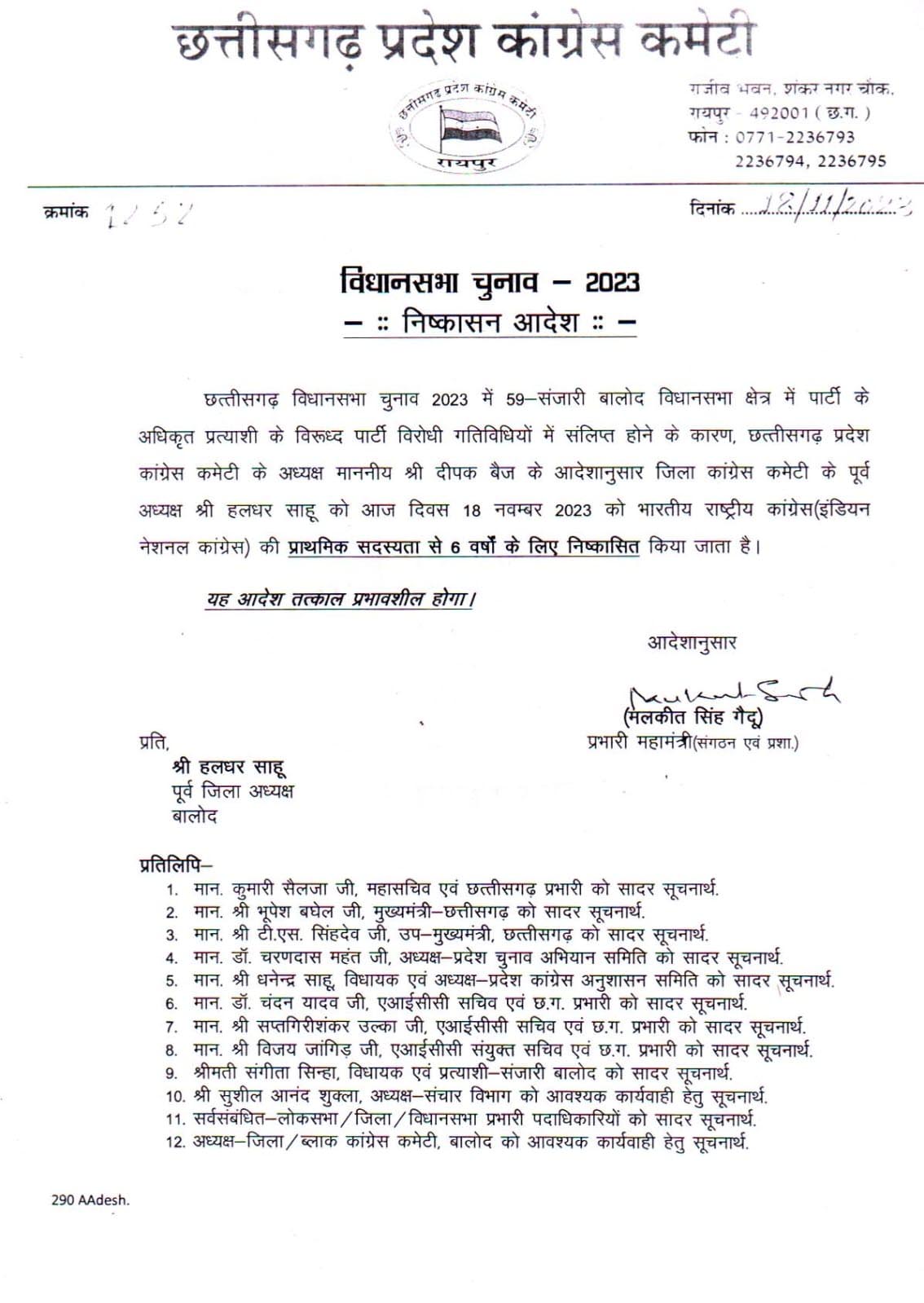 रायपुर। कांग्रेस ने हलधर साहू को 6 साल के लिए पार्टी से बाहर कर दिया है. मलकीत सिंह गैदू द्वारा जारी आदेश में लिखा है कि छत्तीसगढ़ विधानसभा चुनाव 2023 में 59 – संजारी बालोद विधानसभा क्षेत्र में पार्टी के अधिकृत प्रत्याशी के विरूध्द पार्टी विरोधी गतिविधियों में संलिप्त होने के कारण, छत्तीसगढ़ प्रदेश कांग्रेस कमेटी के अध्यक्ष दीपक बैज के आदेशानुसार जिला कांग्रेस कमेटी के पूर्व अध्यक्ष हलधर साहू को आज दिवस 18 नवम्बर 2023 को भारतीय राष्ट्रीय कांग्रेस (इंडियन नेशनल कांग्रेस) की प्राथमिक सदस्यता से 6 वर्षों के लिए निष्कासित किया जाता है।