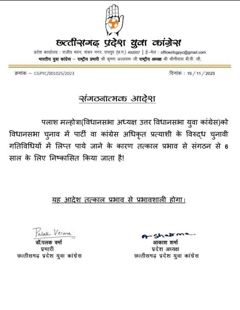 पलाश मल्होत्रा (विधानसभा अध्यक्ष उत्तर विधानसभा युवा कांग्रेस) को विधानसभा चुनाव में पार्टी और कांग्रेस अधिकृत प्रत्याशी के खिलाफ चुनावी गतिविधियों में लिप्त पाए जाने के कारण तत्काल प्रभाव से संगठन से 6 साल के लिए निष्कासित कर दिया है. उनके जगह नवाज खान को जिम्मेदारी सौंपी गई है.