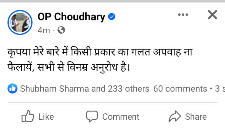 रायपुर। भाजपा ने छत्तीसगढ़ विधानसभा चुनाव में ऐतिहासिक जीत दर्ज की है। एग्जिट पोल के सभी अनुमानों पर उलटफेर करते हुए बीजेपी प्रदेश में अपनी सरकार बना रही है। रायगढ़ से प्रत्याशी IAS ओपी चौधरी ने शानदार जीत दर्ज करते हुए सुनहरे राजनीतिक भविष्य में एंट्री कर की है, वहीं उन्हें बड़ी जिम्मेदारी मिलने की अटकलों तेज है। कोई उन्हें मुख्यमत्री पद का दावेदार बता रहा है, तो कोई डिप्टी सीएम पद का। इन सबके बीच ओपी चौधरी ने खुद सोशल मीडिया पर पोस्ट कर लोगों से अपील की है कि वो उनके बारे में गलत अफवाह ना फैलायें।