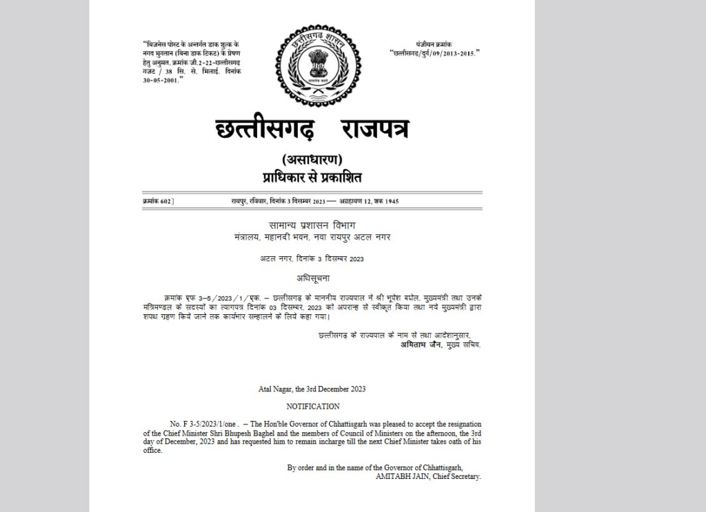 हालांकि राज्यपाल ने इस्तीफा मंजूर करते हुए बघेल को नई सरकार के गठन तक कार्यभार संभालने के लिए कहा गया है। बता दें कि भूपेश बघेल और उनके मंत्रिमंडल के सदस्यों के त्याग पत्र के संबंध में दो अधिसूचना जारी की गई है। पहली अधिसूचना राजभवन की तरफ से राजभवन के सचिव के हस्ताक्षर से जारी किया गया है। दूसरी अधिसूचना सामान्य प्रशासन विभाग (जीएडी) की तरफ से मुख्य सचिव के हस्ताक्षर से जारी किया गया है।