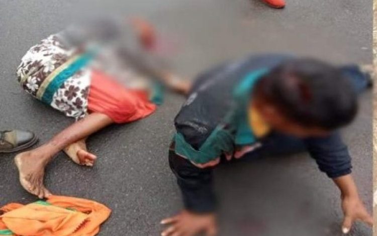 दर्दनाक हादसा; तेज रफ़्तार हाइवा ने मां-बेटे को कुचला, महिला की मौके पर मौत, युवक की हालत गंभीर
