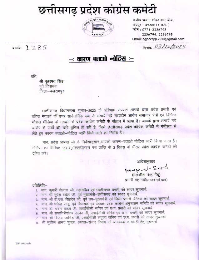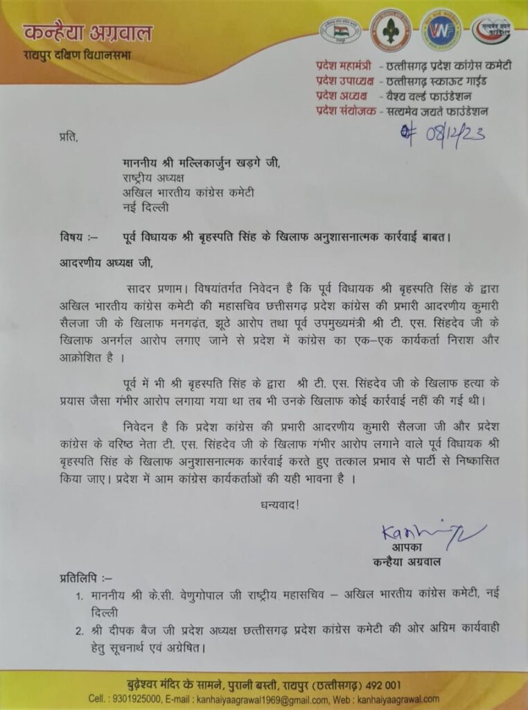 बृहस्पति सिंह पर कार्रवाई नहीं किए जाने का ही परिणाम है कि आज बृहस्पति सिंह ने कांग्रेस की राष्ट्रीय महासचिव छत्तीसगढ़ की प्रभारी कुमारी शैलजा पर भी झूठे और मनगढ़ंत गंभीर आरोप लगाए हैं ऐसे में तत्काल कार्रवाई नहीं किए जाने से अनुशासनहीनता लगातार और बढ़ेगी। कांग्रेस नेताओं ने बृहस्पति सिंह पर कार्रवाई की मांग को लेकर राष्ट्रीय अध्यक्ष श्री मल्लिकार्जुन खड़गे, राष्ट्रीय महासचिव के सी वेणुगोपाल एवं प्रदेश अध्यक्ष दीपक बैज को पत्र लिखा हैं।