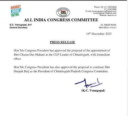 चरणदास महंत होंगे नेता प्रतिपक्ष, AICC ने जारी की प्रेस रिलीज