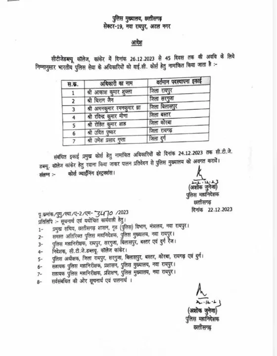 रायपुर। छत्तीसगढ़ में पदस्थ सात आईपीएस अफसरों को कांकेर जंगल वार फेयर कॉलेज में ट्रेनिंग के लिए रिजर्व किया गया है। जारी सूचि में आईपीएस आकाश कुमार शुक्ला, चिराग जैन, अमन कुमार रमन कुमार झा, रविंद्र कुमार मीणा, रोहित कुमार शाह, उदित पुष्कर और उमेश प्रसाद गुप्ता शामिल है।