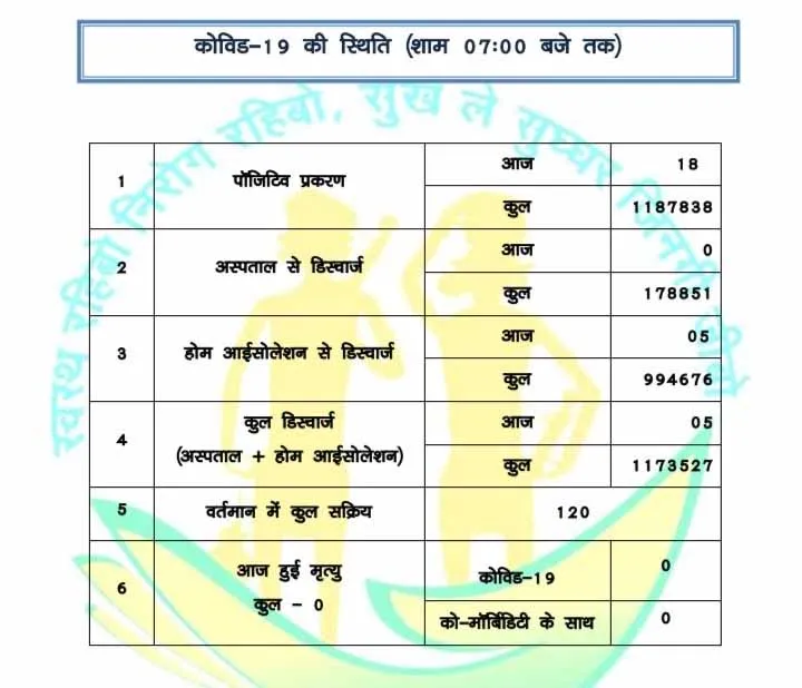 रायपुर। छत्तीसगढ़ में कोरोना अब 16 जिलों में फैल गया है. पॉजिटिविटी दर 0.38 प्रतिशत हो गई है. बुधवार को 4717 कोरोना सैंपल की जांच की गई जिसमें 18 नए कोरोना पॉजिटिव मरीज मिले. दिनों दिन कोरोना मरीजों की संख्या बढ़ने से स्वास्थ्य विभाग भी अलर्ट है. कई जगह मास्क पहनना अनिवार्य कर दिया गया है.