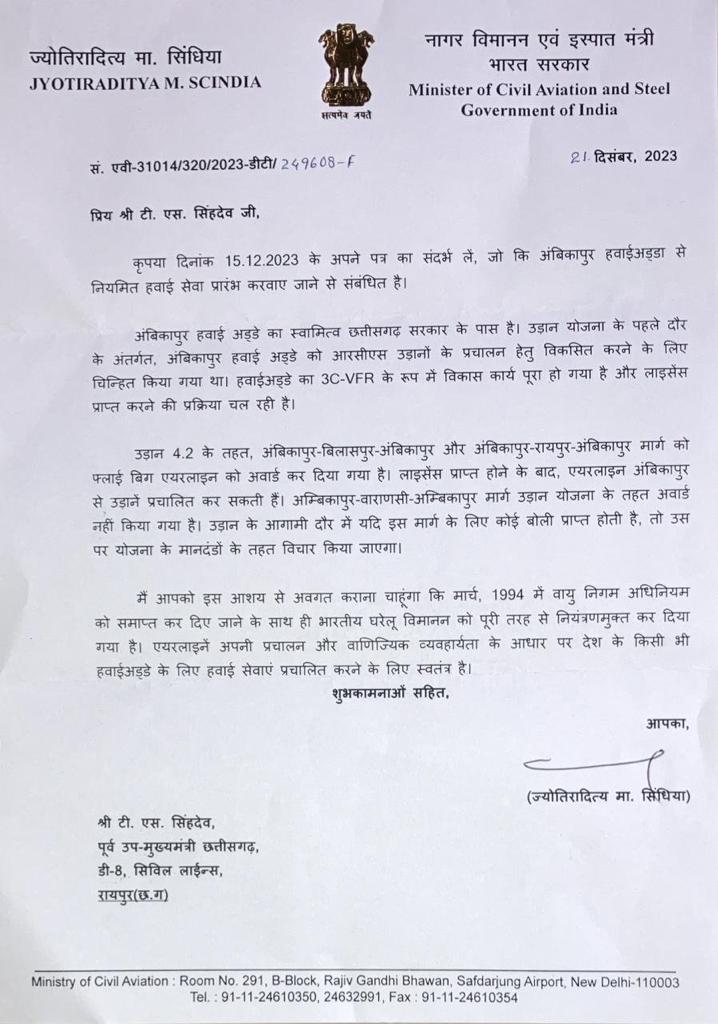 टीएस सिंह देव पूर्व उपमुख्यमंत्री छत्तीसगढ़ शासन के द्वारा दिनांक 15/12/2023 को अंबिकापुर हाईवे अड्डा से नियमित हवाई सेवा प्रारंभ कराए जाने हेतु पत्र लिखा था
