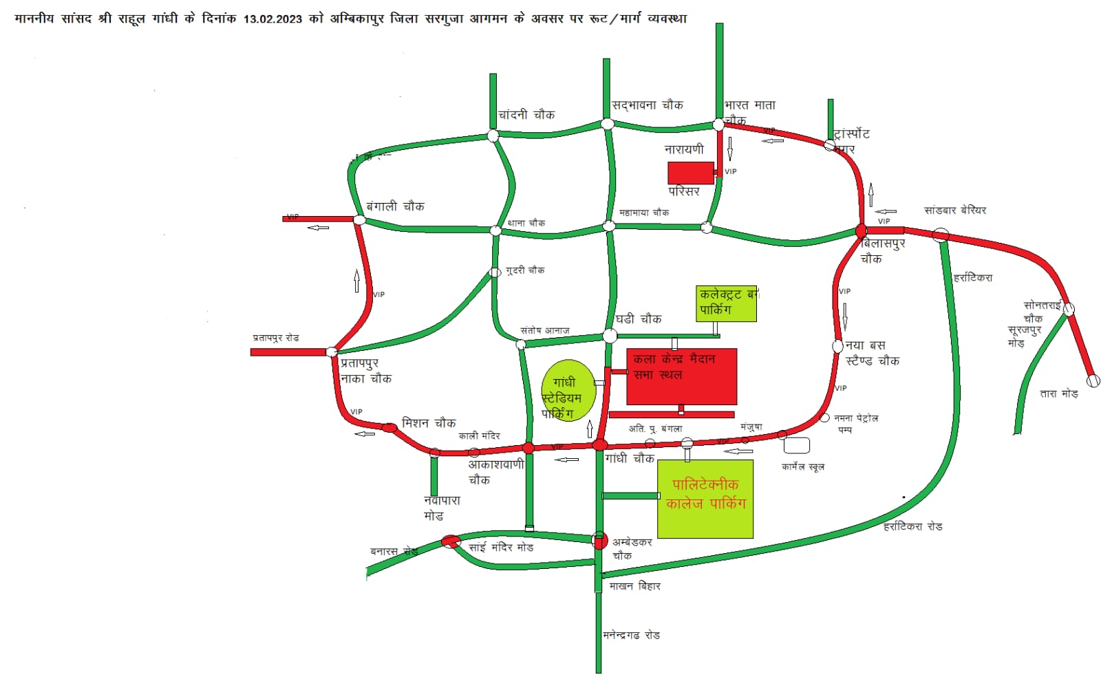 राहुल गांधी के दिनांक 13/02/2023 को अंबिकापुर जिला सरगुजा आगमन के अवसर पर रूट /मार्ग व्यवस्था :-