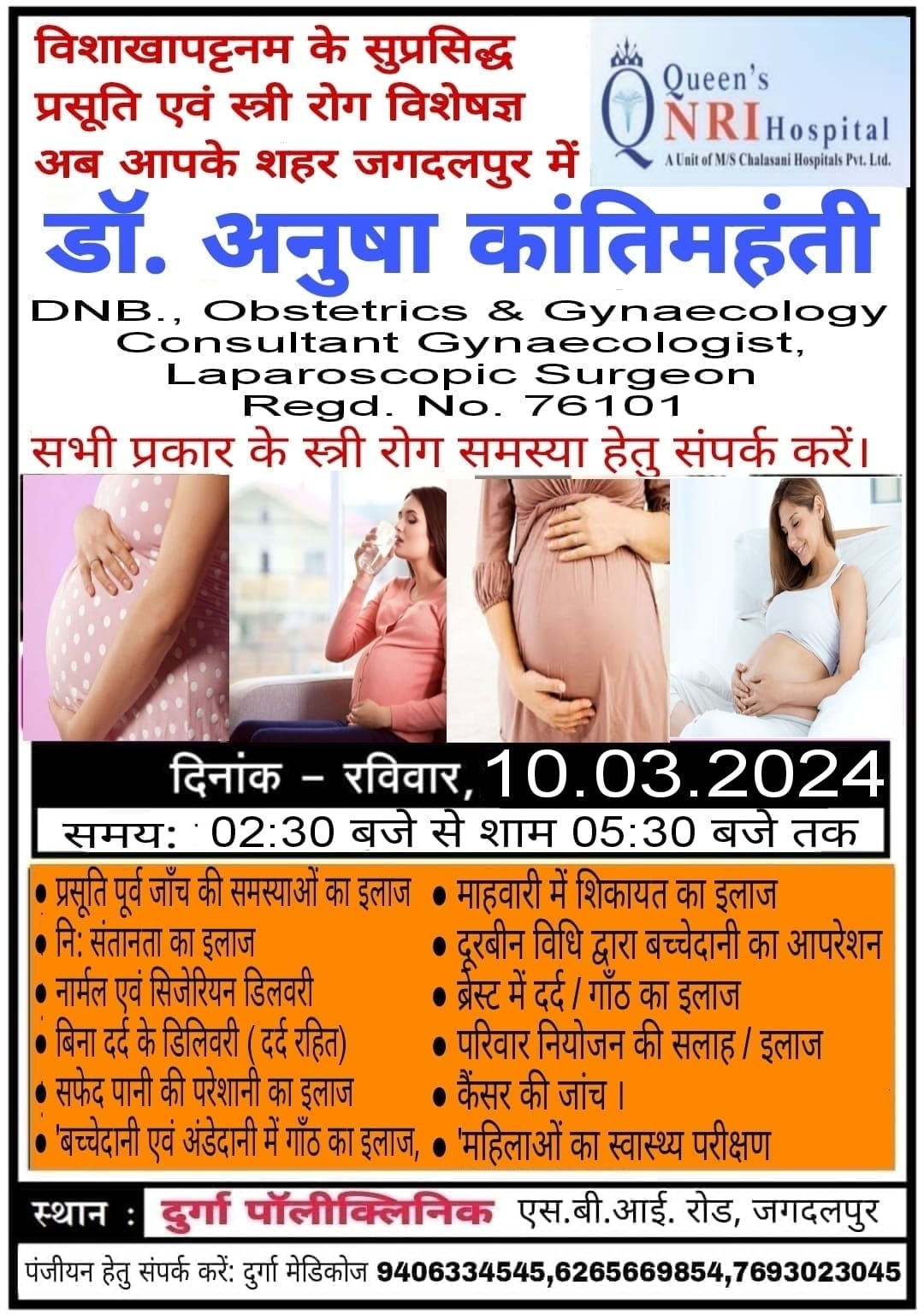 जगदलपुर // विशाखापट्टनम के सुप्रसिद्ध प्रस्तुति एवं स्त्री रोग विशेषज्ञ अब आपके शहर जगदलपुर में डॉ अनुषा कांतिमहंती सभी प्रकार की स्त्री रोग समस्या हेतु संपर्क करें दिनांक 10 मार्च 2024 दिन रविवार समय 2.30 से शाम 5.30 बजे तक प्रस्तुति पूरे जांच की समस्या का इलाज की संतान का इलाज नॉर्मल एवं सिजेरियन डिलीवरी बिना दर्द की डिलीवरी दर्द रहित सफेद पानी की परेशानी का इलाज बच्चेदानी एवं एंड डैनी में गांठ का इलाज महावारी में शिकायत का इलाज दूरबीन विधि द्वारा बच्चेदानी का ऑपरेशन ब्रेस्ट में दर्द गांठ का इलाज परिवार नियोजन की सलाह इलाज कैंसर की जांच महिलाओं का स्वास्थ्य परिषद प्रशिक्षण स्थान दुर्गा मेंडिकोज दुर्गा पॉलीक्लिनिक एसबीआई रोड जगदलपुर पंजीयन हेतु संपर्क करें 9406334545 7693023045 6265669854