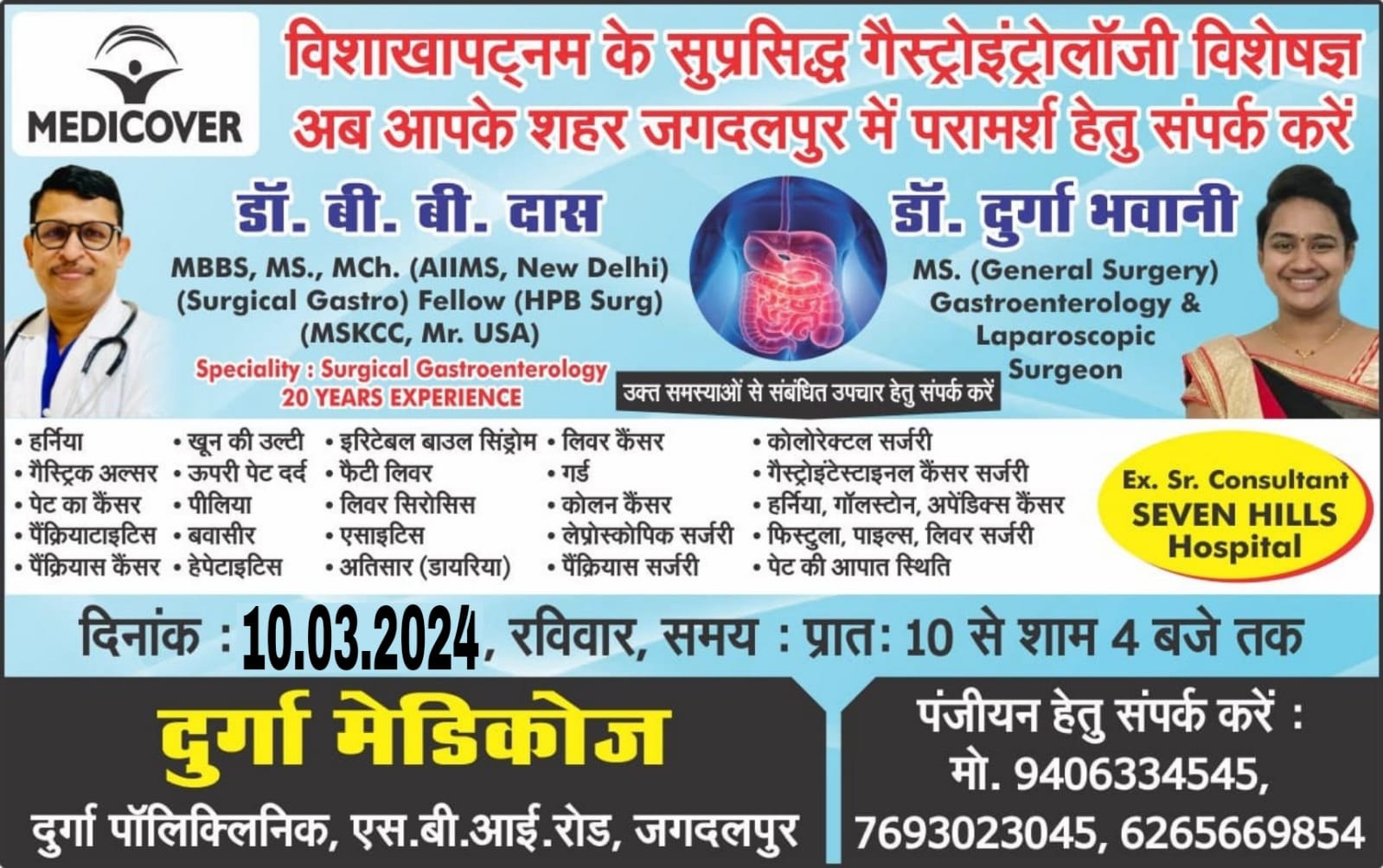 डॉक्टर बीएस दास व दुर्गा भवानी आज शहर में जगदलपुर विशाखापत्तनम की गैस्ट्रोएंटरोलॉजी विशेषज्ञ डॉक्टर बीएस दास एवं डॉक्टर दुर्गा भवानी 10 मार्च रविवार को शहर में उपलब्ध रहेंगे हर्निया गैस्ट्रिक अल्सर खून की उल्टी ऊपर पेट दर्द पीलिया बवासीर हेपेटाइटिस पेट का कैंसर पेनक्रिएटिक प्रक्रियस कैंसर इरिटेबल बाउल सी रोल फैक्ट्री लिवर लिवर सिरोसिस एसिटिलाइटिस डायरिया लिवर कैंसर गार्डन कोलन कैंसर प्रोग्रेस कॉपी सर्जरी प्रक्रिया आरसी सर्जरी किलो रेक्टल सर्जरी गेस्ट इंटरनल कैंसर ऐपेटाइट अपेंडिक्स कैंसर फिस्टुला,पाइल्स लीवर सर्जरी अप की आपात स्थिति जैसी सभी समस्याओं के लिए डॉक्टर बीएस दास एवं डॉक्टर दुर्गा भवानी जी से परामर्श ले सकते हैं यह कैंप दुर्गा मेडिकोज एवं दुर्गा पॉलीक्लिनिक एसबीआई रोड जगदलपुर में सुबह 10:00 बजे से शाम 4:00 बजे तक उपलब्ध रहेग पंजीयन हेतु संपर्क करें 9406334545 7693023045 6265669854