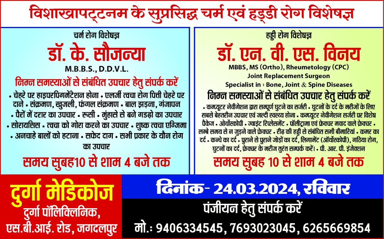 विशाखापट्टनम के सुप्रसिद्ध हड्डी रोग विशेषज्ञ अब आपके शहर जगदलपुर में परामर्श हेतु संपर्क करें डॉक्टर डा एन.वी.एस.विनय जोड़ों में दर्द में मरीज के लिए खुशखबरी कंप्यूटर नेविगेशन द्वारा संपूर्ण घुटने की सर्जरी घुटनों के दर्द के मरीजों के लिए सबसे बेहतरीन उपचार एवं जल्दी स्वस्थ होना कंप्यूटर नेविगेशन सर्जरी पर विशेष पैकेज आर्थ्रोस्कॉपी ज्वाइंट रिप्लेसमेंट और फैक्चर मवाद वाले फैक्चर लंबे समय सी जोड़ने वाले फैक्चर रन की हड्डी से संबंधित सभी बीमारियां कमर का दर्द कंधे का दर्द पुराने से पुराने जोड़ों का दर्द लिगामेंट आर्थ्रोस्कॉपी गठिया रोग घुटने का दर्द फैक्चर के मरीज तुरंत संपर्क करें पीआरपी इंजेक्शन दिनांक 24 मार्च रविवार समय प्रातः 10:00 बजे से 4:30 बजे तक प्रत्येक माह की चौथे रविवार को परामर्श ले सकते हैं यह कैंप दुर्गा मेडिकोज एवं दुर्गा पॉलीक्लिनिक एसबीआई रोड जगदलपुर में सुबह 10:00 बजे से शाम 4:00 बजे तक उपलब्ध रहेग पंजीयन हेतु संपर्क करें 9406334545 7693023045 6265669854