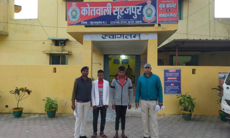 पुलिस अधीक्षक श्री रामकृष्ण साहू ने फरार आरोपियों की पतासाजी गंभीरतापूर्वक करते हुए गिरफ्तार करने के निर्देश थाना प्रभारी को दिए थे। अतिरिक्त पुलिस अधीक्षक मधुलिका सिंह व एसडीओपी सूरजपुर प्रकाश सोनी के मार्गदर्शन में फरार आरोपियों की पतासाजी की जा रही थी इसी बीच मुखबीर की सूचना पर आरोपी ताराचंद देवांगन पिता बलधारी राम उम्र 23 वर्ष व शिवप्रसाद देवांगन उम्र 19 वर्ष निवासी ग्राम पोड़ी को दबिश देकर पकड़ा गया, जिनके कब्जे से लूट किया गया 1 नग मोबाईल बरामद कर दोनों को गिरफ्तार किया गया। मामले में 2 अन्य आरोपी फरार है जिनकी पतासाजी सरगर्मी से की जा रही है। इस कार्यवाही में थाना प्रभारी सूरजपुर प्रकाश राठौर, प्रधान आरक्षक ऐसन पाल, इसित बेहरा, आरक्षक राधेश्याम साहू, हरिशंकर सिंह सक्रिय रहे।