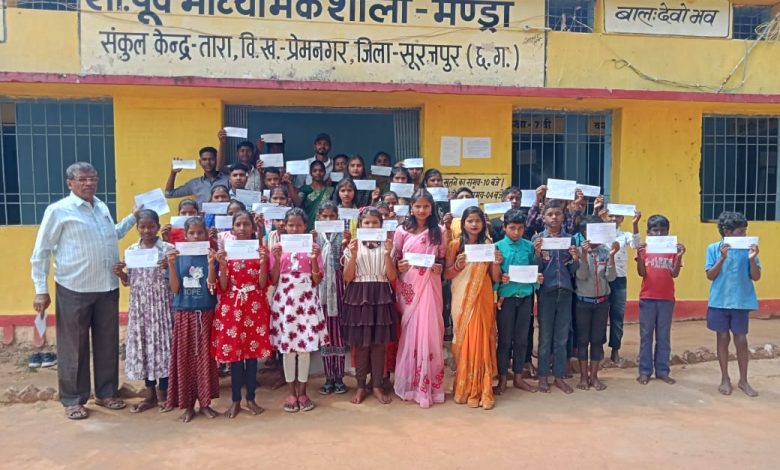 सूरजपुर// स्वीप कार्यक्रम के तहत मतदाताओं को अनिवार्य रूप से मतदान करने के लिए प्रेरित करने की दृष्टि से जिले के समस्त शैक्षणिक संस्थानों में विद्यार्थियों के माध्यम से अपने अभिभावकों को पत्र लिख कर मतदान हेतु जागरूक किया जा रहा है इसी क्रम में कलेक्टर एवं निर्वाचन अधिकारी श्री रोहित व्यास के मार्गदर्शन में समस्त विकासखंड सूरजपुर 24384, रामानुजनगर 7986, प्रेमनगर 7538, भैयाथान 15126, ओड़गी 12012, से कुल योग 92,383 छात्र-छात्राओं के द्वारा मतदाता जागरूकता करने हेतु अपने अभिभावकों को पत्र लिखा गया।
