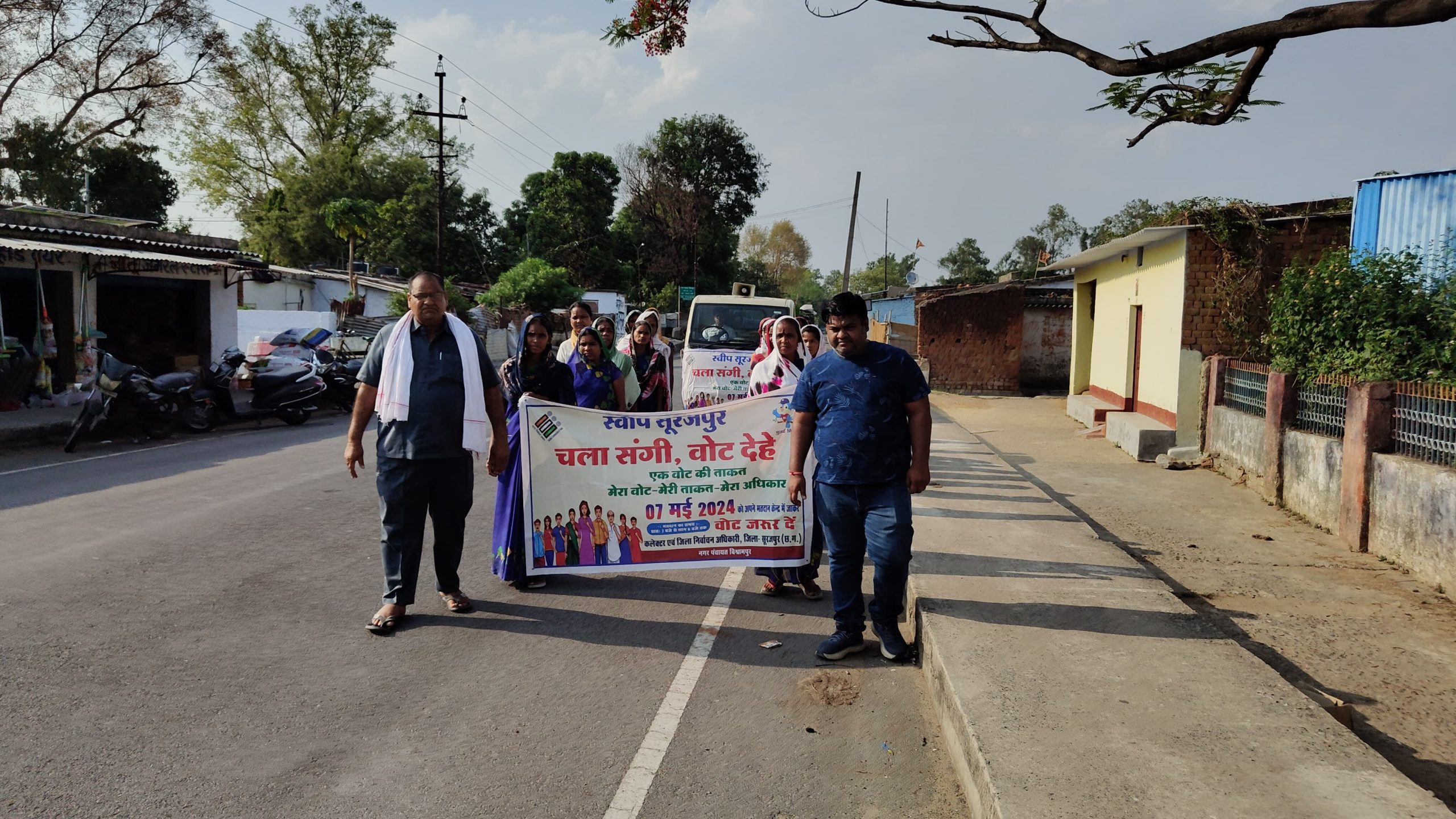 नगर पंचायत में मतदाता जागरूकता अभियान इन दिनों रोज चलाया जा रहा है जिससे मतदाता जागरूकता अभियान रथ के साथ छोड़ो सारे काम चलो करें पहले मतदान वोट डालने जाना है अपना फर्ज निभाना है इस प्रकार के स्लोगन से मतदाता जागरूकता का संदेश लोगों को दिया जा रहा है। कलेक्टर के नेवता पाती लोकसभा निर्वाचन 2023 हेतु आमंत्रण पत्र देकर आम नागरिकों को मतदान हेतु आमंत्रित किया गया इसी संदेश के साथ आज नगर पंचायत विश्रामपुर के अधिकारी कर्मचारी गण एवं स्वच्छता दीदी तथा स्वयं सहायता समूह के सदस्यों के द्वारा रैली निकाली गई ।इस रैली में नगर पंचायत के सीएमओ सुशील कुमार तिवारी, उप अभियंता तरंग मित्तल , आकाश , अब्दुल हैदर, जयप्रकाश तिर्की, स्वयं सहायता समूह के सदस्य स्वच्छता दीदी आदि शामिल थी।