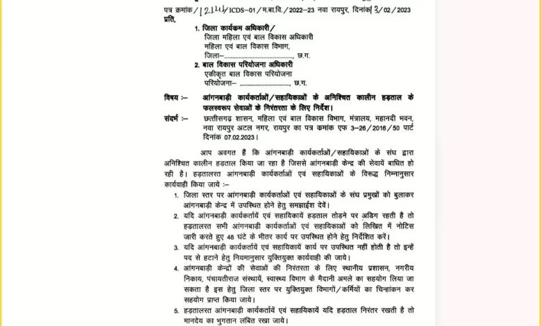 रायपुर। आंगनवाड़ी कार्यकर्ताओं और सहायिकाओं की हड़ताल को लेकर राज्य सरकार ने कड़ा रुख अपना लिया है। महिला बाल विकास विभाग की तरफ से सभी जिला कार्यक्रम अधिकारी और बाल विकास परियोजना अधिकारी को निर्देश जारी कर हड़ताल के संदर्भ में कड़े फैसले लेने के निर्देश दिए हैं।