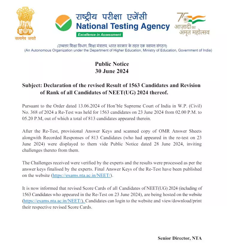एजुकेशन डेस्क, नई दिल्ली सोमवार, 1 जुलाई को, राष्ट्रीय पात्रता सह प्रवेश परीक्षा (NEET UG) 2024 की पुनर्परीक्षा के नतीजों की घोषणा राष्ट्रीय परीक्षा एजेंसी (NTA) ने की है।