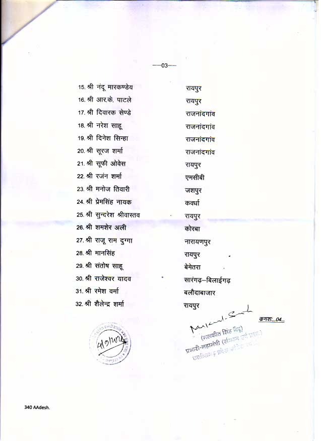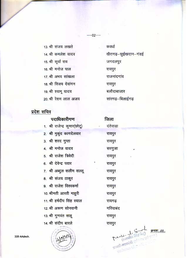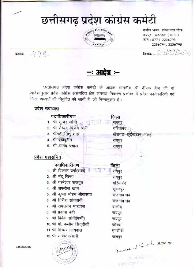 रायपुर- छत्तीसगढ़ प्रदेश कांग्रेस कमेटी के अध्यक्ष दीपक बैज के आदेशानुसार प्रदेश कांग्रेस असंगठित क्षेत्र समस्या निवारण प्रकोष्ठ में प्रदेश कार्यकारिणी एवं जिला अध्यक्षों की नियुक्ति की जाती है, जो निम्नानुसार है :-