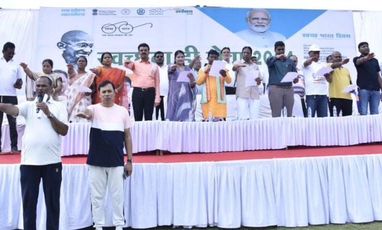 जगदलपुर// मंगलवार को जगदलपुर शहर के धरमपुरा क्रीड़ा परिसर में, ‘स्वच्छता ही सेवा’ पखवाड़ा के तहत आयोजित जिला स्तरीय कार्यक्रम में सांसद महेश कश्यप ने लोगों को स्वच्छता की शपथ दिलाई। कार्यक्रम में महापौर श्रीमती सफीरा साहू, पार्षदगण, कलेक्टर हरिस एस, सीईओ जिला पंचायत प्रकाश सर्वे, आयुक्त नगर निगम हरेश मंडावी, गणमान्य नागरिक, अधिकारी-कर्मचारी, शिक्षक-शिक्षिकाएं, बड़ी संख्या में विद्यार्थी और नगर निगम के स्वच्छता दीदियां भी उपस्थित हुए। इस दौरान क्रीड़ा मैदान और कन्या पालिटेक्निक मैदान साफ किए गए। वहीं, विद्यार्थियों ने स्वच्छता का संदेश देते हुए बस्तर और गांधी जी के चश्मे की मानव श्रृंखला बनाई।