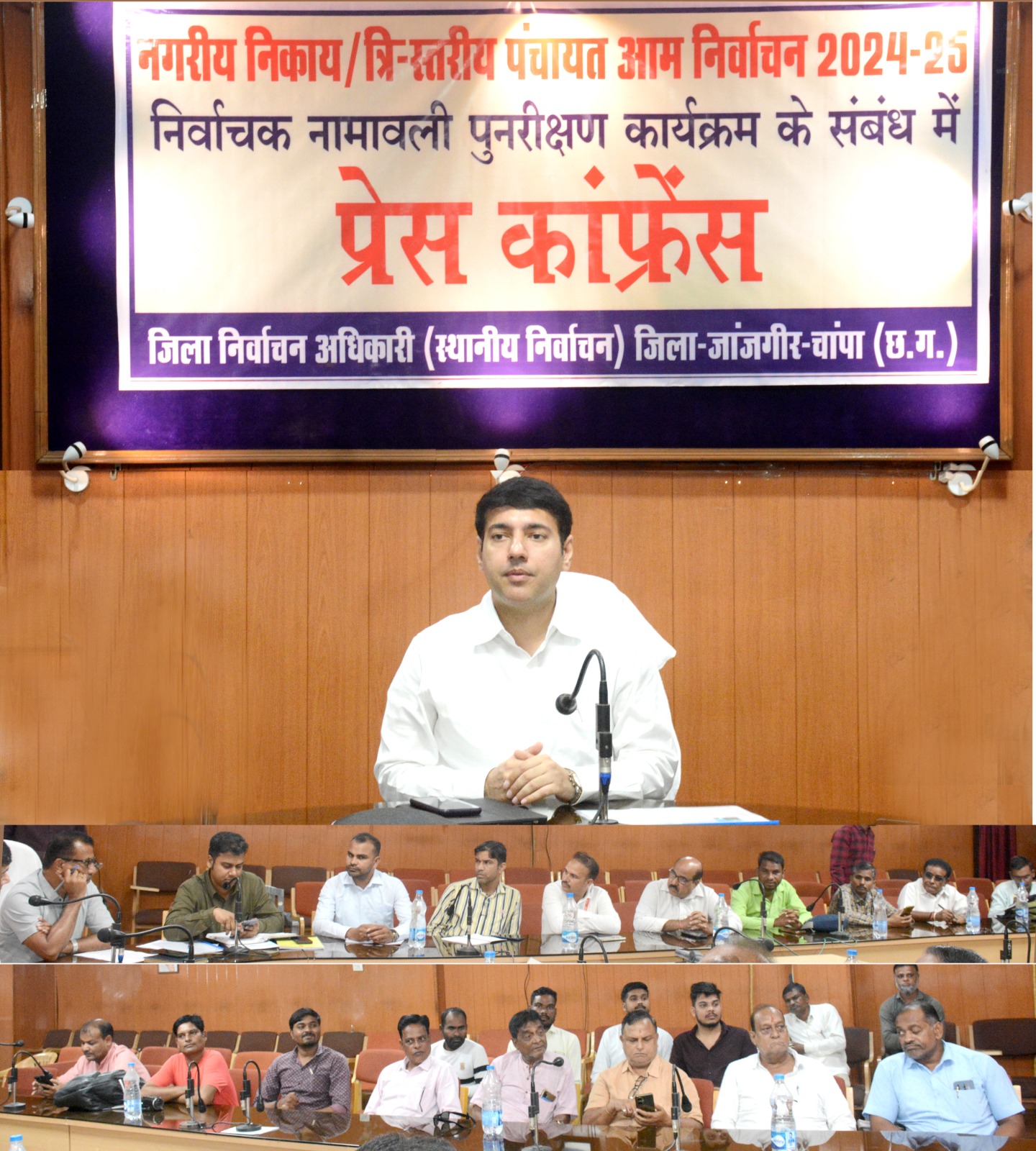 जांजगीर-चांपा // छ.ग.राज्य निर्वाचन आयोग रायपुर द्वारा नगर पालिका एवं त्रिस्तरीय पंचायतों के आम निर्वाचन हेतु निर्वाचक नामावली पुनरीक्षण किये जाने का कार्यक्रम जारी किया गया है और मतदाता सूची का प्रारंभिक प्रकाशन कर दिया गया है। कलेक्टर एवं जिला निर्वाचन अधिकारी आकाश छिकारा की अध्यक्षता में आज जिले के सभी राजनैतिक दलों के पदाधिकारियों, प्रतिनिधियों एवं मीडिया प्रतिनिधियों के साथ जिला कार्यालय सभाकक्ष जांजगीर में बैठक आयोजित की गई। उन्होंने नगरीय निकाय एवं त्रिस्तरीय पंचायत निर्वाचन के निर्वाचक नामावली के पुनरीक्षण कार्यक्रम के संबंध में निर्वाचक नामावली में 01 जनवरी 2024 की स्थिति में निर्वाचक नामावली में नाम जुड़ाने, संशोधन एवं विलोपन की प्रकिया से अवगत कराया।