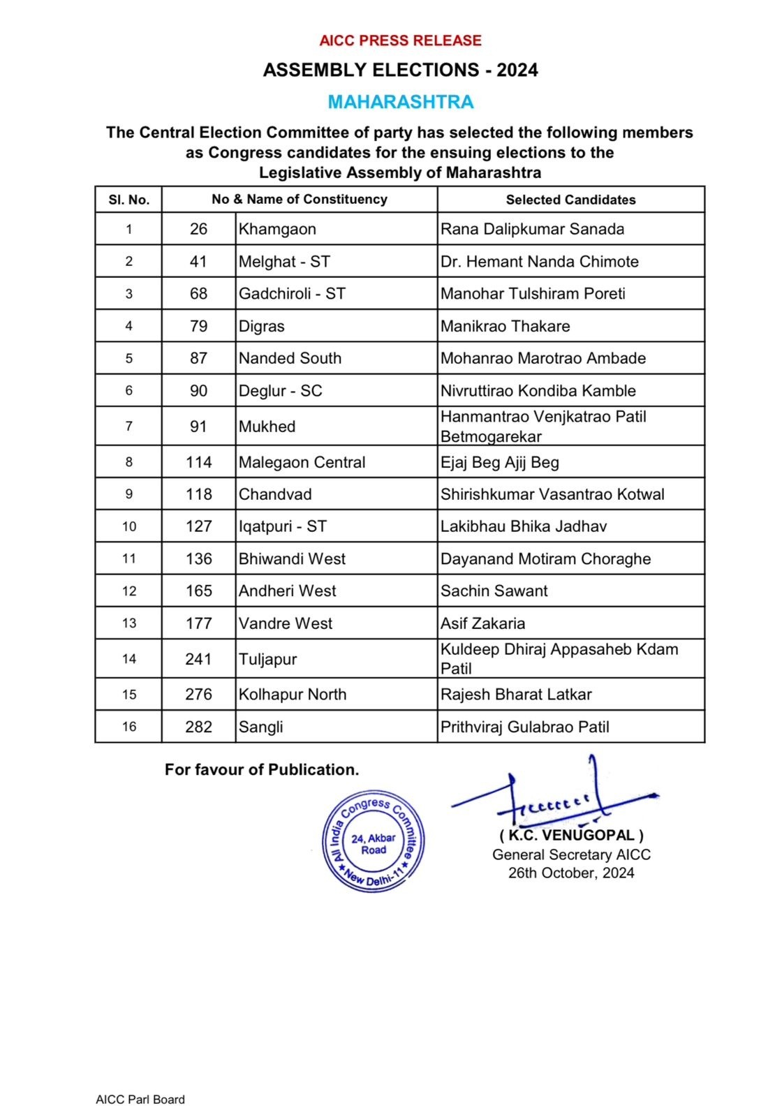 महाराष्ट्र विधानसभा चुनाव के लिए कांग्रेस उम्मीदवारों की तीसरी सूची।