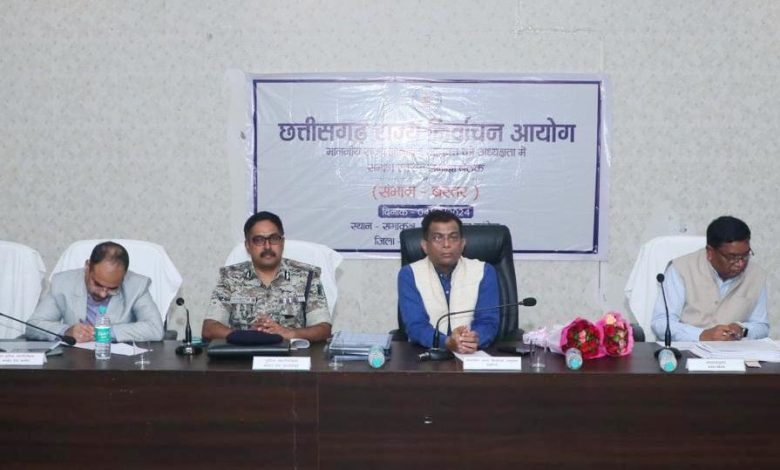 उत्तर बस्तर कांकेर/ राज्य निर्वाचन आयुक्त अजय सिंह की अध्यक्षता में आज जिला पंचायत के सभाकक्ष में सुबह 11.00 बजे लेकर नगरीय निकायों एवं त्रिस्तरीय पंचायतों में आगामी आम/उप निर्वाचन अंतर्गत निर्वाचन कार्यों की तैयारियों के संबंध समीक्षा की गई। बैठक में बस्तर संभाग के संभाग आयुक्त श्री डोमन सिंह, पुलिस महानिरीक्षक सुंदरराज पी., पुलिस विभाग के नोडल अधिकारी ओ.पी. पाल, आयोग के सचिव डॉ. सर्वेश्वर नरेन्द्र भुरे सहित संभाग के सभी जिला के कलेक्टर एवं पुलिस अधीक्षक तथा उप जिला निर्वाचन अधिकारी शामिल हुए। इस दौरान राज्य निर्वाचन आयुक्त ने सभी अधिकारियों को बस्तर संभाग में पारदर्शिता, निष्पक्षता के साथ शांतिपूर्ण ढंग से निर्वाचन सम्पन्न कराने के निर्देश दिए।