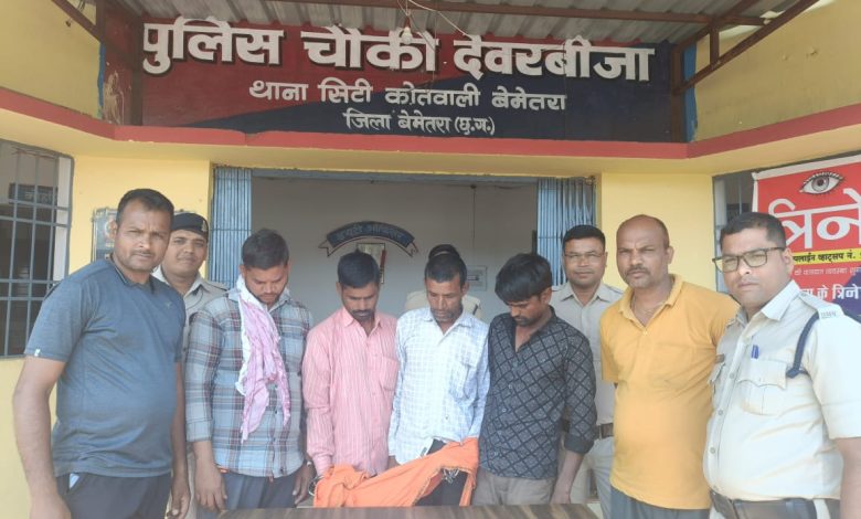 बेमेतरा – चौकी देवरबीजा क्षेत्रांतर्गत ग्राम भैसामुडा में 8 मार्च को तालाब पार के पास आम जगह में कुछ लोग रूपये पैसे का दांव लगाकर काट पत्ती जुआ खेल रहे हैैं की सुचना पर चौकी देवरबीजा पुलिस टीम पहुच कर सुचना के अधार पर रेड कार्यवाही कर जुआडियों को पकडे। जिसमें 1 प्रकरण दर्ज कर 4 जुआडियों जितेन्द्र ऊर्फ जित्तु घृतलहरे उम्र 32 साल साकिन सिरसा, भुपत साहू उम्र 35 साल साकिन बाबा सिंघौरी, प्रकाश वर्मा उम्र 30 साल साकिन तेन्दुभाठा थाना साजा, चौनू साहू उम्र 48 साल साकिन थैसामुडा चौकी देवरबीजा जिला के विरूद्ध धारा 3 (2) छत्तीसगढ़ जुआ (प्रतिषध) अधिनियम 2022 के तहत कार्यावाही की गई हैं। जुआडियों के पास एवं फड से कुल जुमला नगदी 7480 रूपये एवं 52 पत्ती तास को जप्त कर कार्यवाही किया गया हैं। उक्त कार्यवाही में उपनिरीक्षक योगेश अग्रवाल, प्रधान आरक्षक अशरफ खान, भागवत सिंह आरक्षक रमेश चंद्रवंशी, कैलाश पाटिल, रामेश्वर पटेल, प्रवीण वर्मा, डामन धीवर, छोटू राम टेंबुलकर, गजानन पटेल एवं अन्य स्टाफ का सराहनीय भुमिका रही।