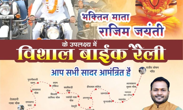 रायपुर// छत्तीसगढ़ प्रदेश साहू संघ,युवा प्रकोष्ठ द्वारा भक्तिन माता राजिम जी की जयंती के अवसर पर जयंती के एक दिन पहले 06 जनवरी को राजधानी रायपुर से राजिम तक भव्य बाईक रैली निकाली जाएगी। इस बाईक रैली में युवा प्रकोष्ठ के रायपुर समेत प्रदेश के अलग-अलग क्षेत्रों से पदाधिकारी शामिल होंगे। तेलघानी नाका चौक में उपमुख्यमंत्री अरुण साव, पूर्व गृहमंत्री ताम्रध्वज साहू,अखिल भारतीय तैलिक साहू महासभा के राष्ट्रीय युवा अध्यक्ष एवं कसडोल विधायक संदीप साहू तथा छत्तीसगढ़ प्रदेश साहू संघ के अध्यक्ष टहल सिंग साहू जी के आतिथ्य में यह बाईक रैली सम्पन्न होगी,जिसमें अतिथियों द्वारा बाइक रैली को हरा झंडा दिखाकर रवाना किया जाएगा। बाईक रैली के राजिम पंहुचने के बाद माता की आरती कर कार्यक्रम का समापन किया जाएगा। 07 जनवरी को राजिम में छत्तीसगढ़ प्रदेश साहू संघ के नेतृत्व में विशाल सभा का आयोजन किया जाएगा जिसमें प्रदेश भर से स्वजातीय जन शामिल होंगे।