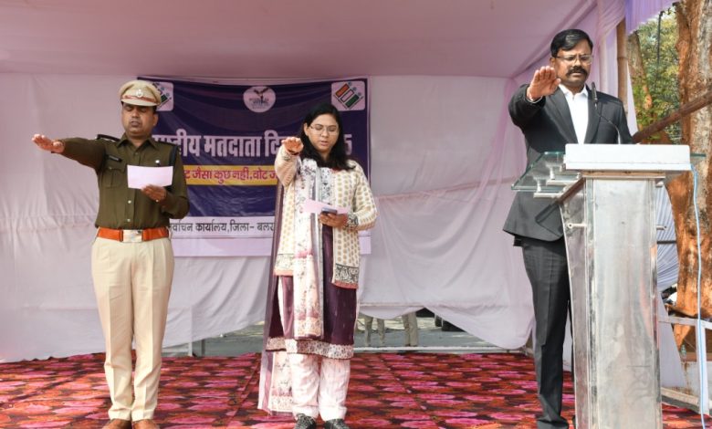 बलरामपुर/ पुलिस ग्राउंड बलरामपुर में कलेक्टर एवं जिला निर्वाचन अधिकारी राजेंद्र कटारा ने मतदाता दिवस के अवसर पर शपथ दिलाई। इस अवसर पर प्रभारी पुलिस अधीक्षक विश्व दीपक त्रिपाठी, जिला पंचायत सीईओ श्रीमती नयनतारा सिंह उपस्थित रहे। कलेक्टर कटारा ने अधिकारी-कर्मचारियों एवं नवीन मतदाताओं को मतदाता दिवस के अवसर पर लोकतंत्र में पूर्ण आस्था रखते हुए स्वतंत्र, निष्पक्ष एवं शांतिपूर्ण निर्वाचन की गरिमा को अक्षुण्ण रख निर्भीक होकर धर्म, वर्ग, जाति समुदाय, भाषा अथवा अन्य किसी प्रलोभन से प्रभावित हुए बिना सभी निर्वाचनों में अपने मताधिकार का प्रयोग करने की शपथ दिलायी। इस अवसर पर अपर कलेक्टर आर.एस.लाल, अनुविभागीय अधिकारी राजस्व बलरामपुर अमित श्रीवास्तव, सहित जिला स्तरीय अधिकारी, बड़ी संख्या में छात्र-छात्राएं व नवीन मतदाता उपस्थिति रहे।