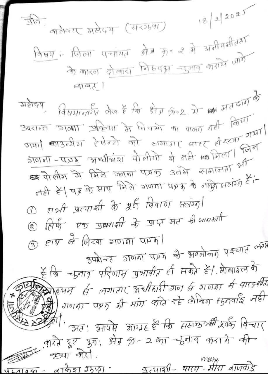 जिला पंचायत क्षेत्र क्रमांक 2 में मतगणना में धांधली का आरोप लगाते हुए जिला कांग्रेस अध्यक्ष राकेश गुप्ता ने पुनः मतदान की मांग कलेक्टर से की है। इस बाबत एक ज्ञापन इस क्षेत्र से कांग्रेस समर्थित प्रत्याशी पारस मीरा राजवाड़े ने कलेक्टर को दिया है। जिला कांग्रेस अध्यक्ष और प्रत्याशी ने शिकायत की है कि मतगणना के दौरान पंचों के मतगणना अभिकर्ता को छोड़ अन्य उम्मीदवारों के मतगणना अभिकर्ताओं को मतगणना कक्ष से बाहर निकाल दिया गया था। मतगणना की गणना पर्ची तक उपलब्ध नहीं कराई गई है।निर्धारित प्रारूप में मतगणना की गणना पर्ची उपलब्ध कराने के बजाय हस्तलिखित प्रारूप में बनाया गया है। माझपारा और सुन्दरपुर के मतदान केंद्रों में चुनाव कर्मचारियों ने इसी प्रकार की गणना पर्ची जारी की है। कई मतदान केंद्रों से ऐसे गणना पर्ची जारी किये गए हैं जिसमें कुल मतगणना के अलावा मात्र एक निर्दलीय प्रत्याशी को प्राप्त मतों का उल्लेख है। शेष प्रत्याशियों के मतों को गणना पर्ची पर दर्ज ही नहीं किया गया है। कांग्रेस समर्थित प्रत्याशी ने आरोप लगाया है कि मतदान केंद्र पर कर्मचारी भाजपा समर्थित प्रत्याशी को विजयी बनाने के लिए पक्षपात पूर्ण ढंग से कार्य कर रहे थे। प्रत्याशी ने कहा है कि करीबी चुनाव में पिछड़ चुके भाजपा समर्थित प्रत्याशी को जितने जे लिए उनके मतों को भाजपा समर्थित प्रत्याशी के पक्ष में समायोजित किया गया है। इसे प्रमाणित करने के लिए पारस मीरा राजवाड़े ने इंद्रपुर मतदान केंद्र से जारी पर्ची को संलग्न किया है जिसमें मात्र निर्दलीय प्रत्याशी को मिले मतों का उल्लेख है। जिला कांग्रेस अध्यक्ष राकेश गुप्ता ने आरोप लगाया है कि भाजपा समर्थित प्रत्याशी के पति चूंकि भाजपा सरकार के अहम हिस्सा हैं, इसलिए यहाँ व्यापक पक्षपात कर उन्हें विजय दिलाया गया है। कांग्रेस समर्थित प्रत्याशी ने इस धांधली के विरुद्ध पुनः मतदान की मांग कलेक्टर से किया है। ऐसा नहीं होने पर उच्च न्यायालय में इस निर्वाचन और उसकी प्रक्रिया को चुनौती देने का फैसला लिया गया है।