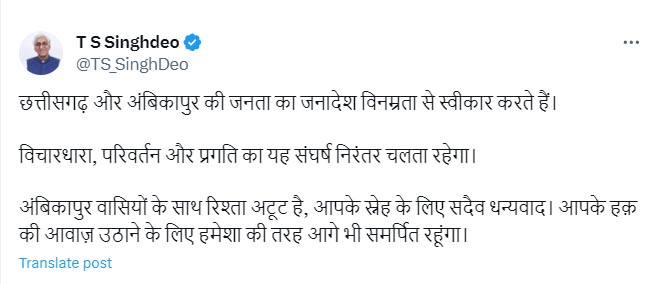टीएस सिंहदेव ने हार के बाद किया ये ट्वीट