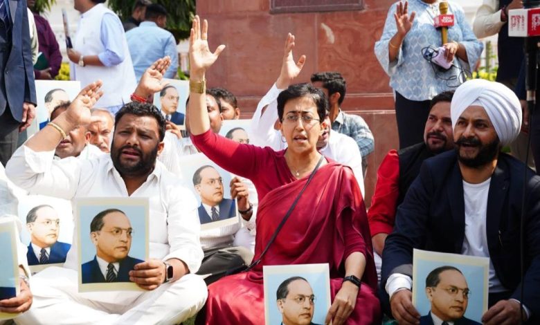 आप विधायक आतिशी, सौरभ भारद्वाज और दुर्गेश पाठक ने भाजपा पर आरोप लगाते हुए कहा कि भगवा पार्टी आंबेडकर और भगत सिंह के विचारों से डरती है और इसलिए उनके विचारों को दबाने की कोशिश कर रही है।
