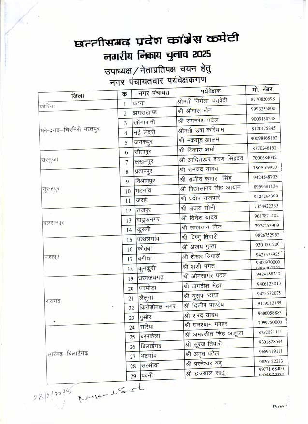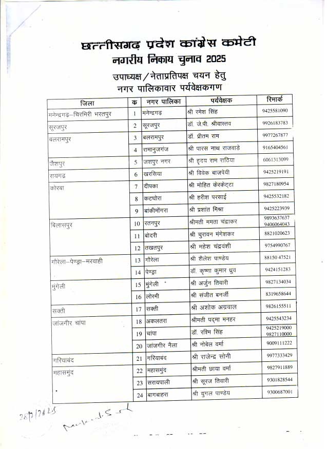 रायपुर, छत्तीसगढ़ प्रदेश कांग्रेस कमेटी (सीजीपीसीसी) ने हाल ही में संपन्न हुए नगरीय निकाय एवं त्रि-स्तरीय पंचायत चुनावों के बाद नगर निगम, नगर पालिका एवं नगर पंचायतों में सभापति, नेता प्रतिपक्ष और उपाध्यक्षों के चयन तथा जिला पंचायतों में अध्यक्ष एवं उपाध्यक्षों के निर्वाचन को लेकर महत्वपूर्ण कदम उठाया है। प्रदेश कांग्रेस अध्यक्ष माननीय दीपक बैज के निर्देशानुसार, इन पदों के चयन एवं निर्वाचन की प्रक्रिया को सफलतापूर्वक संपन्न कराने के लिए पर्यवेक्षकों की नियुक्ति की गई है।