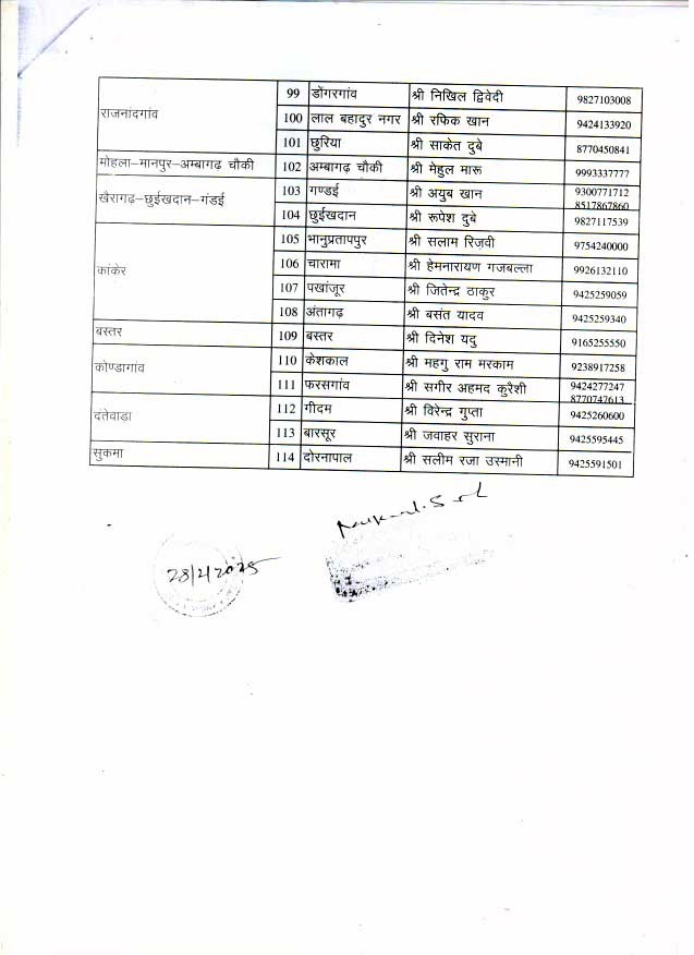 छत्तीसगढ़ प्रदेश कांग्रेस कमेटी द्वारा जारी आदेश में पर्यवेक्षकों की एक सूची संलग्न की गई है, जिसमें कई वरिष्ठ नेताओं को महत्वपूर्ण जिम्मेदारियां दी गई हैं। इन पर्यवेक्षकों को यह सुनिश्चित करने की जिम्मेदारी दी गई है कि नगर निगम, नगर पालिका और पंचायत चुनावों में कांग्रेस समर्थित प्रत्याशी पूरी मजबूती से चुनाव लड़ें और जीत हासिल करें।